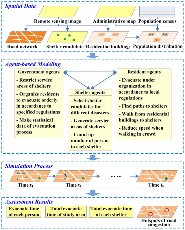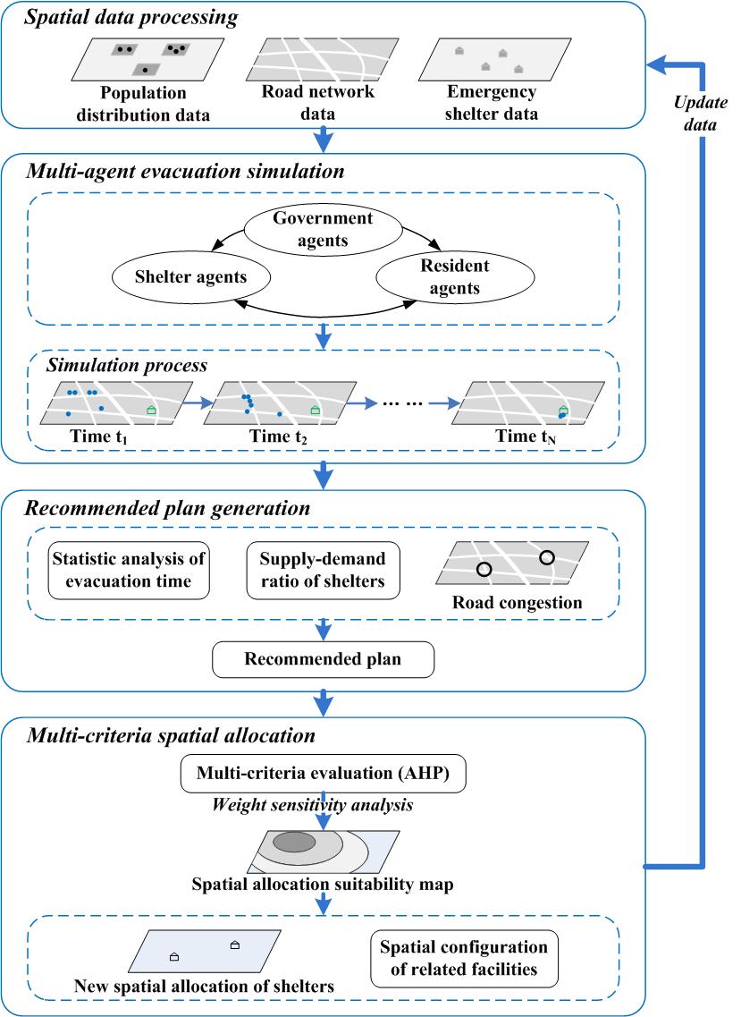 Framework for spatial allocation of urban emergency shelters | | YU Jia, WEN Jiahong, CHEN Yun, LIAO Banggu, DU Shiqiang, 2017, Spatial configuration of urban shelters based on simulation using emergency evacuation agent-based model: A case study in Jing'an District, Shanghai, Acta Geographica Sinica. 72(8), 1347-1364. (EI, CSSCI, CSCD, in Chinese)