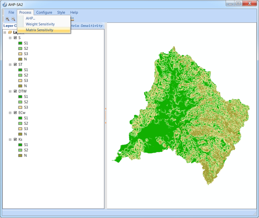 | AHP-SA AHP-SA is a software tool which can analyze weight sensitivity caused by both direct and indirect weight changes using the one-at-a-time (OAT) technique with the Analytical Hierarchy Process (AHP) in the ArcGIS environment. It permits a range of user defined simulations to be performed to quantitatively evaluate model dynamic changes, measures the stability of results with respect to the variation of different parameter weights, and displays spatial change dynamics. Please find the tool at the following URL: AHP-SA2 Tool (ArcGIS10.2).rar